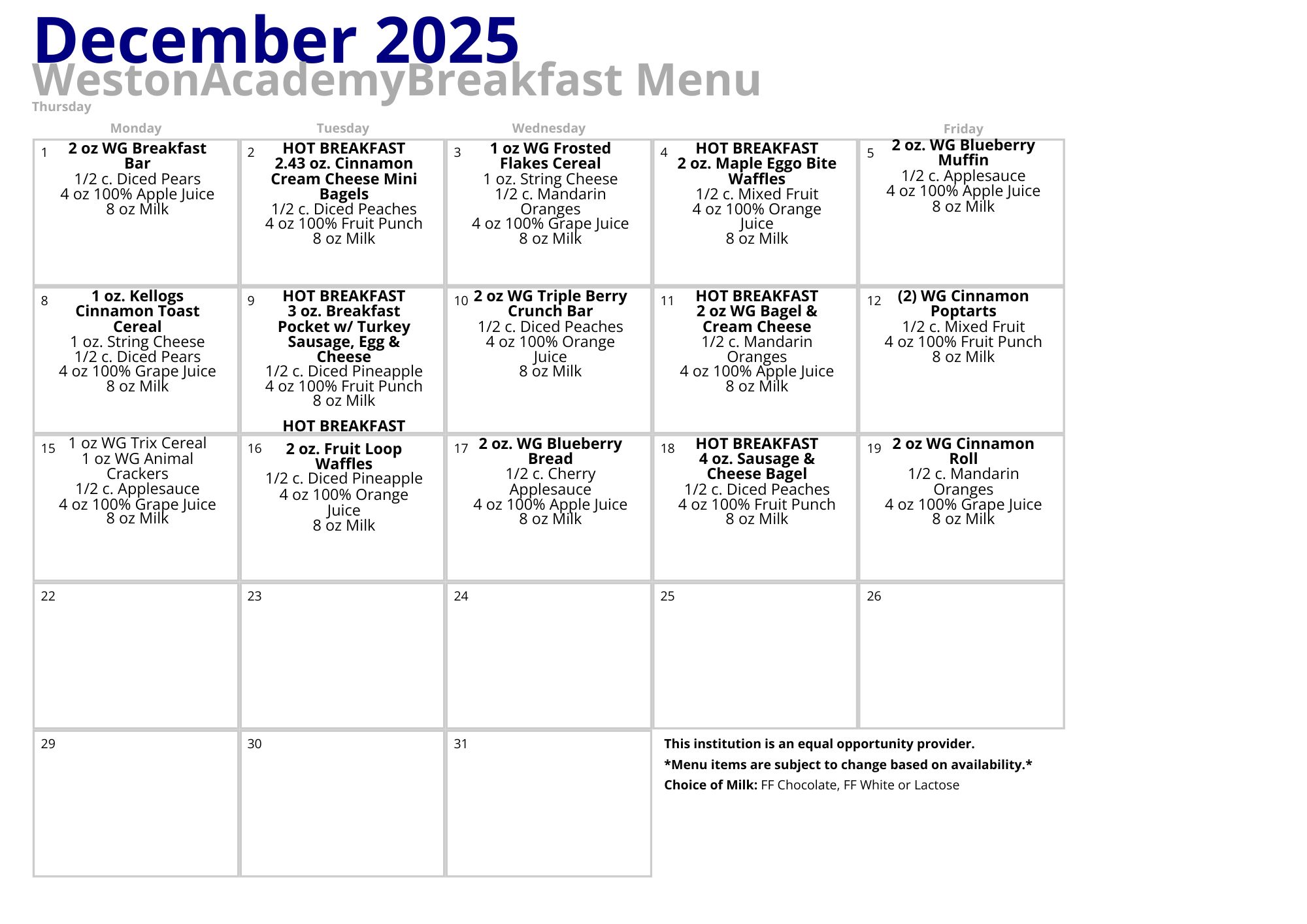 December Breakfast & Lunch Menu
